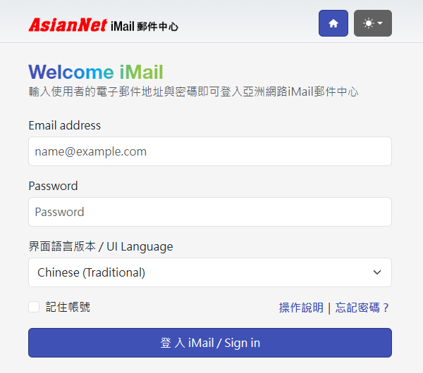 進入 https://imail.asiannet.com/,輸入使用者的電子郵件地址與密碼即可登入亞洲網路iMail郵件中心